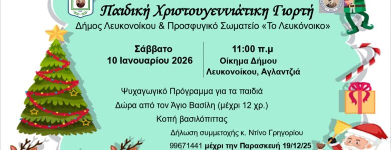 Ο Δήμος Λευκονοίκου και το Προσφυγικό Σωματείο «Το Λευκόνοικο» σας προσκαλούν σε μια όμορφη Παιδική Χριστουγεννιάτικη Γιορτή. Σάββατο 10 Ιανουαρίου 2026 11:00 π.μ Οίκημα Δήμου Λευκονοίκου, Αγλαντζιά
