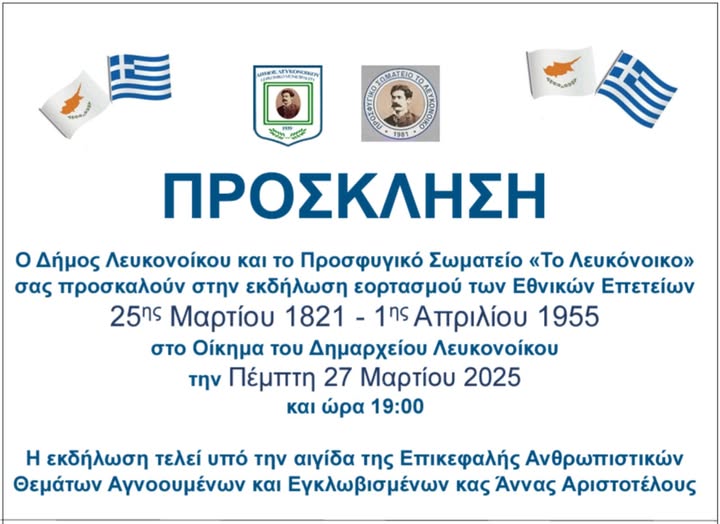 Ο Δήμος Λευκονοίκου και το Προσφυγικό Σωματείο “το Λευκόνοικο” σας προσκαλούν σε εκδήλωση εορτασμού των εθνικών επετείων της 25ης Μαρτίου 1821 και 1ης Απριλίου 1955 που θα γίνει στο οίκημα του Δήμου Λευκονοίκου στην Αγλαντζιά την Πέμπτη 27/3/25 και ώρα 7.00μ.μ.