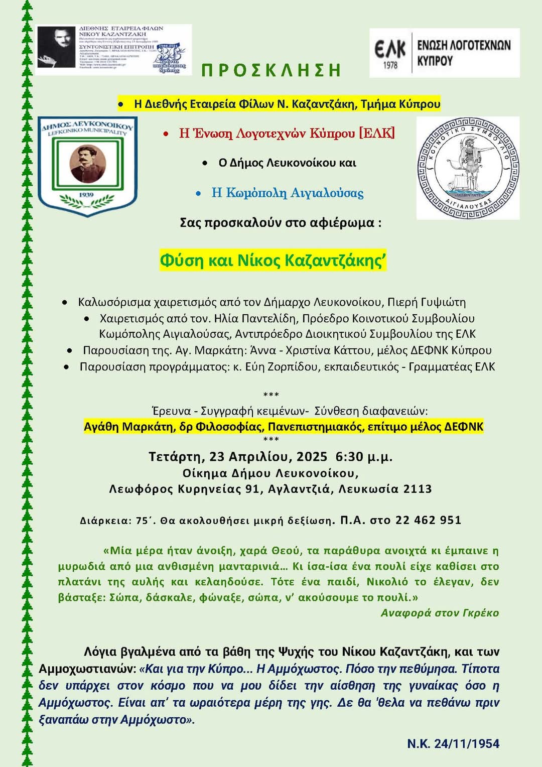 Προσκαλείστε σε εκδήλωση που διοργανώνει η Διεθνής Εταιρεία Φίλων Νίκου Καζαντζάκη, σε συνεργασία με την Ένωση Λογοτεχνών Κύπρου, το Δήμο Λευκονοίκου και την Κωμόπολη Αιγιαλούσας με θέμα :φύση και Νίκος Καζαντζάκης την Τετάρτη 23/4/25 και ώρα 6:30 μ.μ στο οίκημα του Δήμου Λευκονοίκου στην Αγλαντζιά.