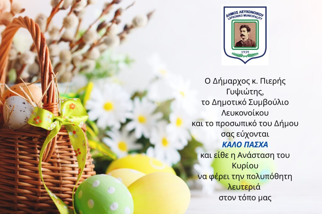 Ο Δήμαρχος κ. Πιερής Γυψιώτης, το Δημοτικό Συμβούλιο Λευκονοίκου και το προσωπικό του Δήμου σας εύχονται ΚΑΛΟ ΠΑΣΧΑ και είθε η Ανάσταση του Κυρίου να φέρει την πολυπόθητη Λευτεριά στον Τόπο μας.