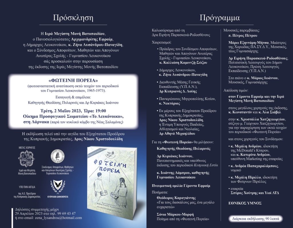 Η Ιερά Μεγίστη Μονή Βατοπαιδίου ο Πανοσιολογιώτατος Αρχιμανδρίτης Εφραίμ, η Δήμαρχος Λευκονοίκου, κ. Ζήνα Λυσάνδρου-Παναγίδη και ο Σύνδεσμος Αποφοίτων. Μαθητών και Απογόνων Ανωτέρας Σχολής – Γυμνασίου Λευκονοίκου παρουσιάζουν την έκδοση της Ιεράς Μεγίστης Μονής Βατοπαιδίου «ΦΩΤΕΙΝΗ ΠΟΡΕΙΑ»