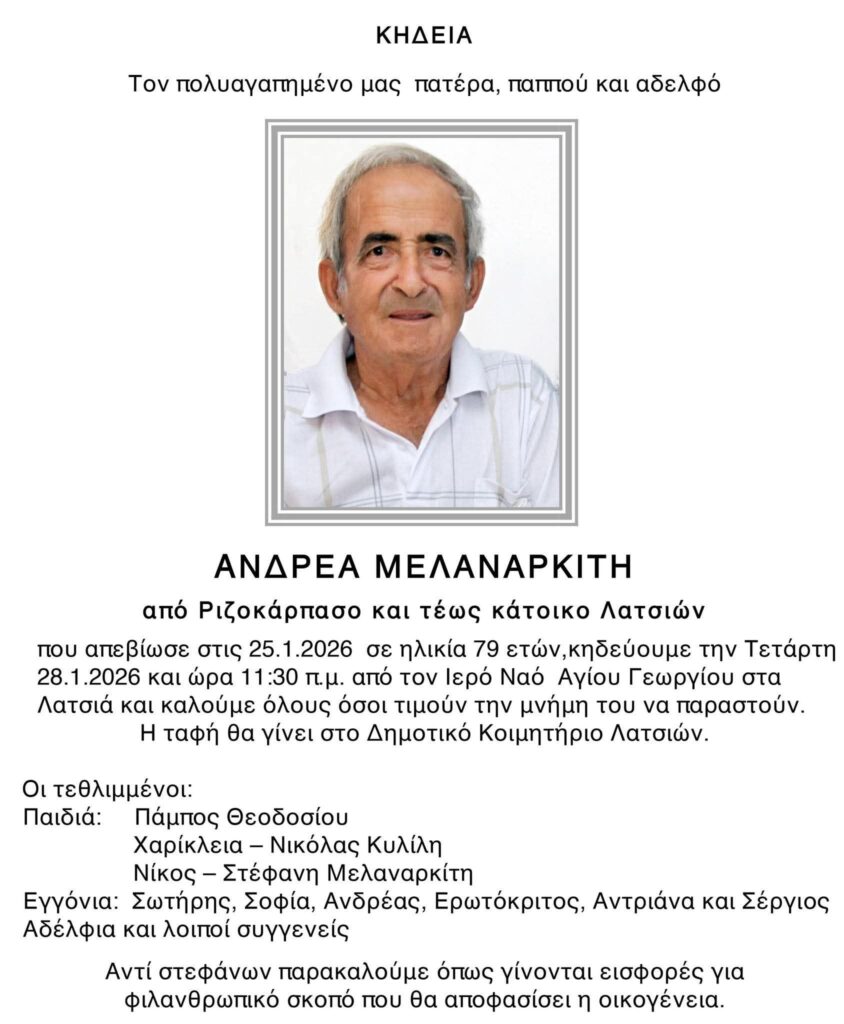 Κηδεία Ανδρέα Μελαναρκίτη, ετών 79, την Τετάρτη 28/1 και ώρα 11:30 π.μ. στον Ι.Ν Αγίου Γεωργίου στα Λατσιά.