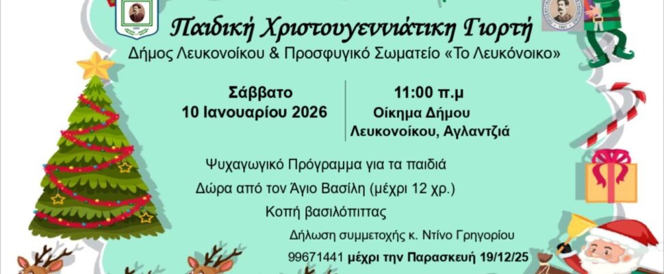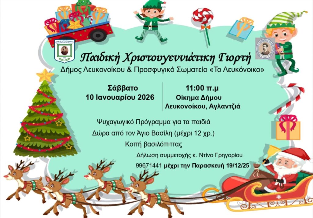 Ο Δήμος Λευκονοίκου και το Προσφυγικό Σωματείο «Το Λευκόνοικο» σας προσκαλούν σε μια όμορφη Παιδική Χριστουγεννιάτικη Γιορτή.